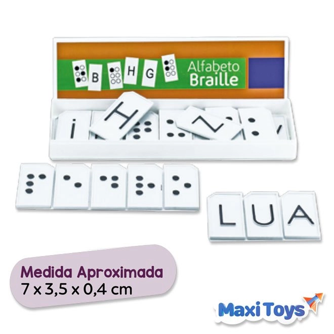 Confeccionado em polipropileno, contém 31 peças com desenhos das letras em alto relevo. Inclui o “ç” e sua correspondência em braille no verso. Acondicionado em caixa de polipropileno com tampa.