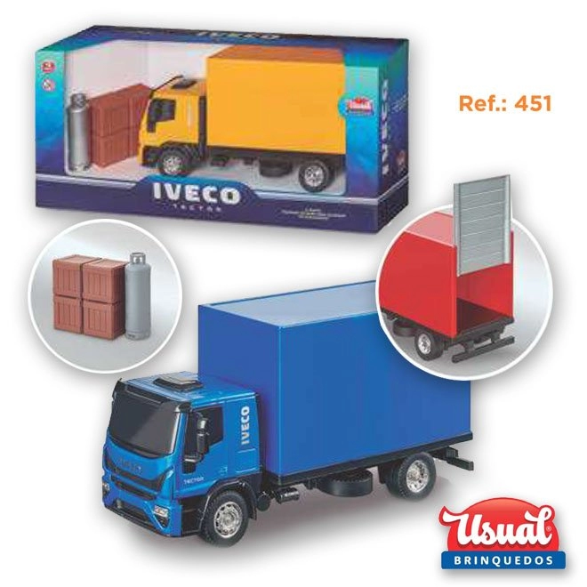 Caminhão Iveco Tector Baú. Composição: POLIPROPILENO. A porta Traseira se abre para carregar e descarregar o Baú. Vem com Acessórios para brincar!