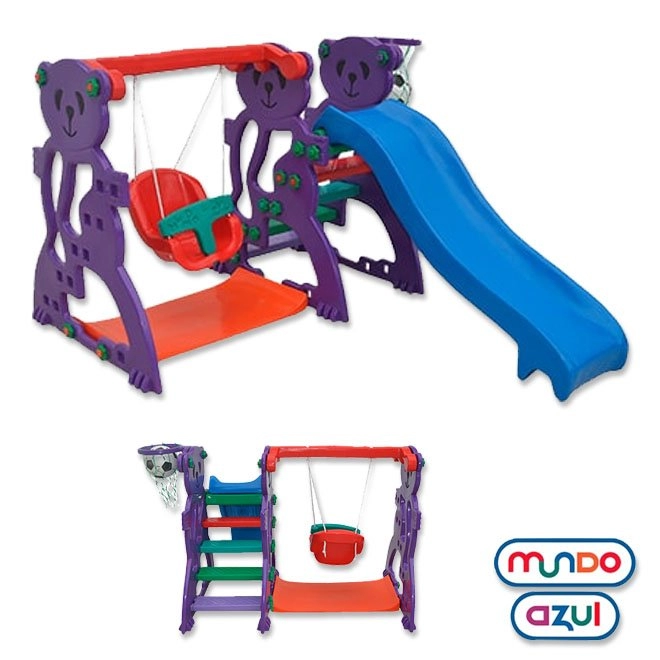 • Playground com laterais em formato de urso. • Escorregador pequeno em forma de tobogã. • Escada colorida de acesso ao escorregador. • Balanço especial para bebê, em formato anatômico com encosto e barra de proteção e orifícios de ventilação no assento, confortável e seguro. • Cordas de nylon macia e resistente. • Tabela de basquete (bola inclusa). • Piso de segurança.