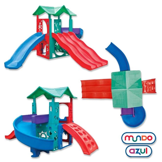 • Playground completo infantil multicolorido com design amplo e exclusivo. • Túnel na parte inferior. • Centro de atividades. • Plataforma superior para acesso aos escorregadores. • Telhado colorido. • Laterais vazadas com temas diversos. • Escorregador em curva. • Escorregador espiral. • Escorregador triplo. • Escalada com apoio para os pés e mãos.