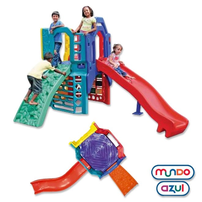 • Playground com jogo interativo. • Escorregador grande em curva com apoio de segurança. • Escalada em curva para acesso à plataforma. • Painel interativo com jogo da velha. • Centro de atividades. • Laterais com abertura para rapel. Plataforma com sistema de escoamento de água.
