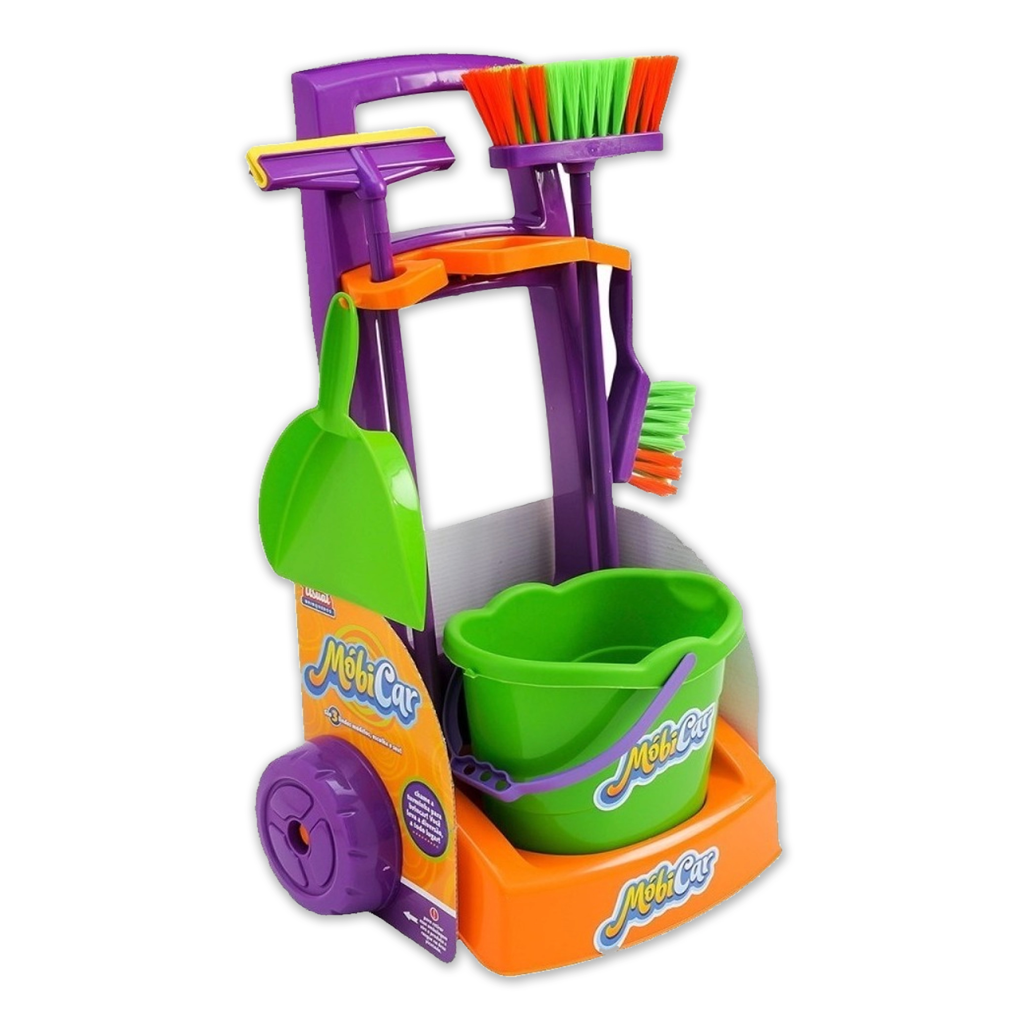 Carrinho de limpeza em lindas cores e recheado de acessórios.