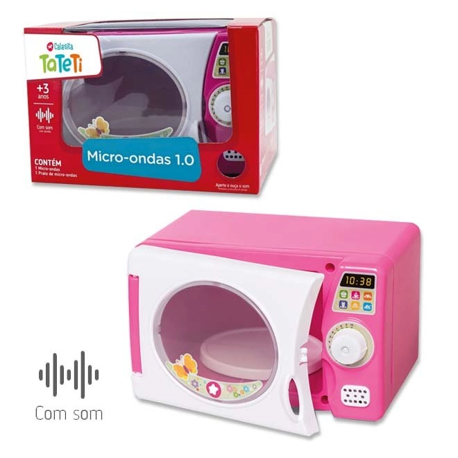 O Micro vem com botão que gira para marcar o tempo e faz barulho igual ao micro-ondas de verdade para avisar quando a comidinha está pronta!
