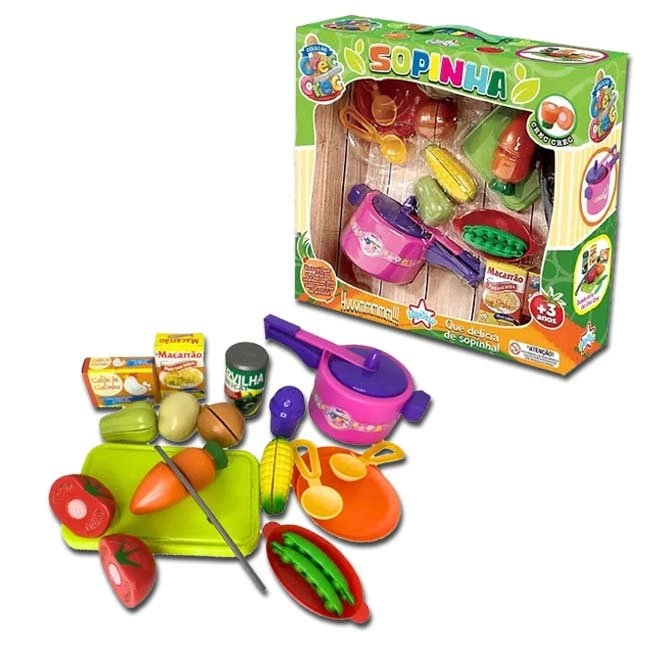 Com este Kit você vai fazer uma sopinha super saborosa de faz de conta, as peças possuem um sistema de velcro que permite que os legumes possam ser cortadas ao meio, depois é só prender o velcro novamente e recomeçar a brincadeira.