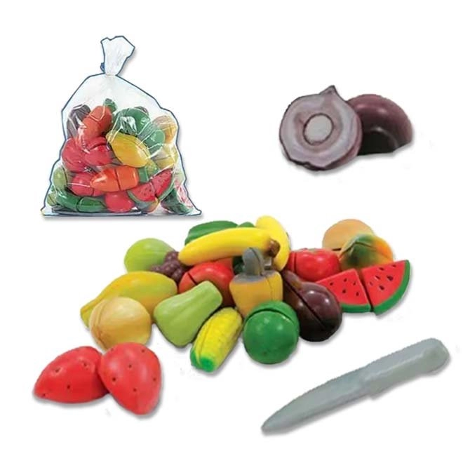As frutas e legumes possuem tiras aderentes que as crianças podem simular cortar com a faca de brinquedo (sem corte) fazendo o som de crec crec, assim como os pais fazem para preparar os alimentos.
