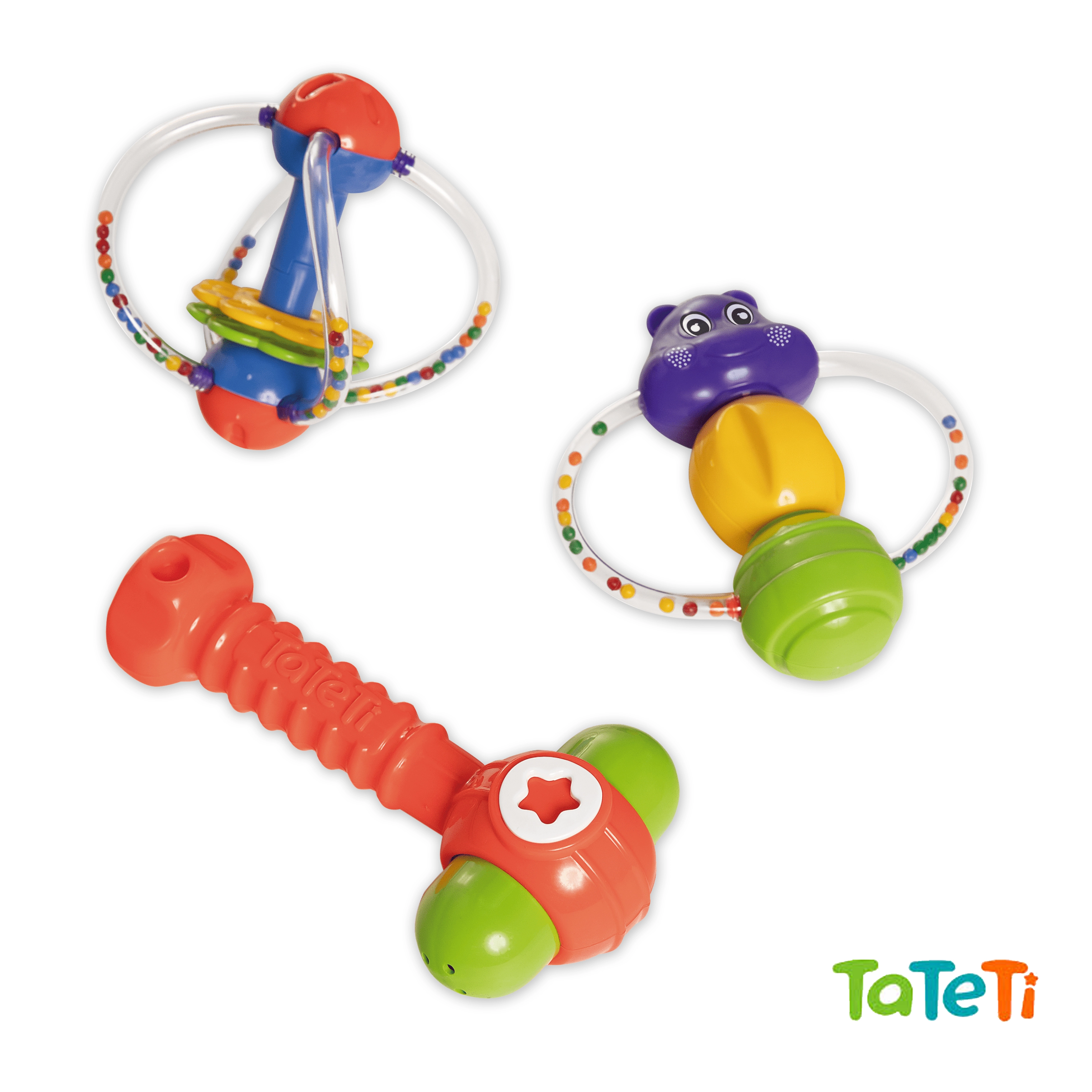 Os 2 chocalhos trazem uma experiência auditiva através das bolinhas dentro dele e o martelinho proporciona uma nova experiência auditiva com o barulho de “fon fon” ao bater.
