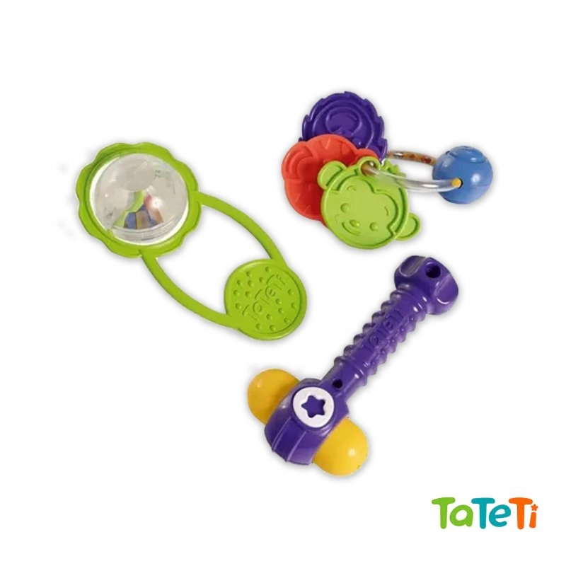 Os 2 chocalhos trazem uma experiência auditiva através das bolinhas dentro dele e o martelinho proporciona uma nova experiência auditiva com o barulho de “fon fon” ao bater.
