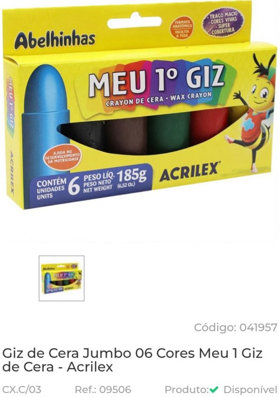 Voltar para a página inicial   >   BAZAR / PAPELARIA / ESCRITÓRIO   >   GIZ DE CERA JUMBO 6 CORES - ACRILEX CX C/ 03