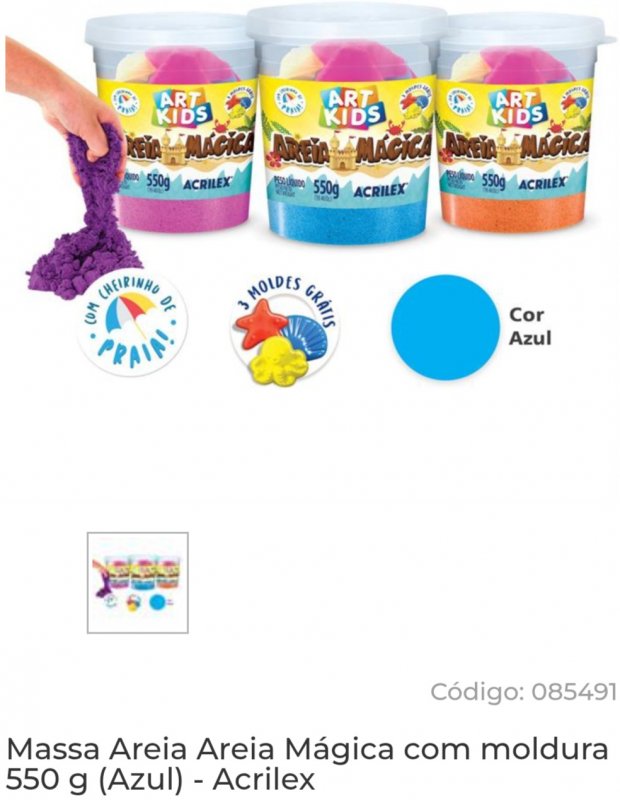 Voltar para a página inicial   >   BAZAR / PAPELARIA / ESCRITÓRIO   >   MASSA AREIA MÁGICA C/ MOLDURA ACRILEX - 500 GR (CORES SORTIDAS)