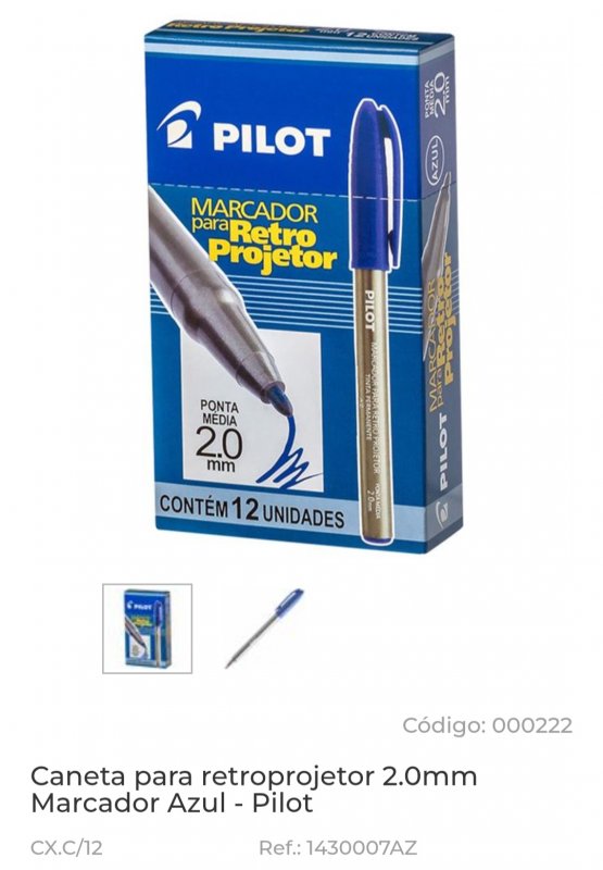 Voltar para a página inicial   >   BAZAR / PAPELARIA / ESCRITÓRIO   >   Caneta para retroprojetor 2.0mm Marcador Azul - Pilot CX.C/12