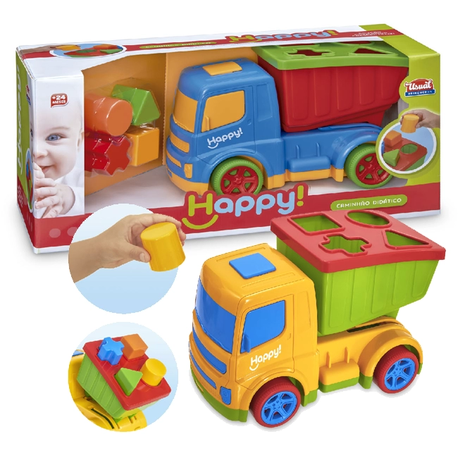 Brinquedo formato Caminhão, com formas geomátricas para encaixe. Através da Dinâmica de Encaixe das peças, a Criança Desenvolve a Coordenação Motora.