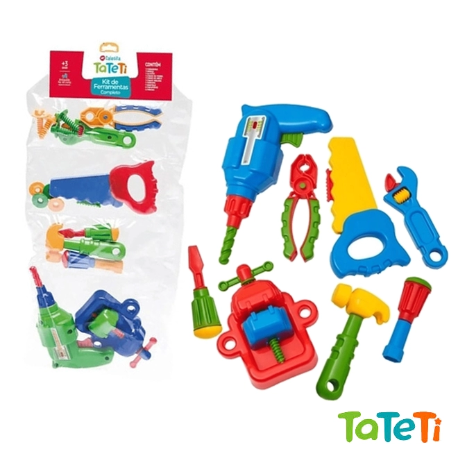 Contém: 1 Furadeira, 1 Morsa, 1 Alicate, 1 Chave de fenda, 1 Chave de boca, 1 Chave inglesa, 1 Serrote, 1 Martelo, 4 Parafusos, 4 Porcas. (+3 anos)