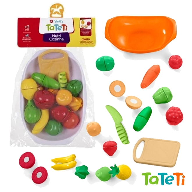 Contém: 14 Miniaturas de frutas e verduras desmontáveis, 1 Tábua, 1 Faca, 1 Fruteira. (+3 anos)