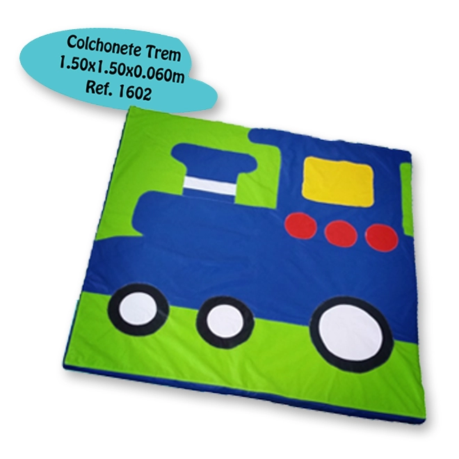 Colchonete confeccionado em corino com desenho de uma locomotiva, tendo espuma de boa densidade em seu interior.