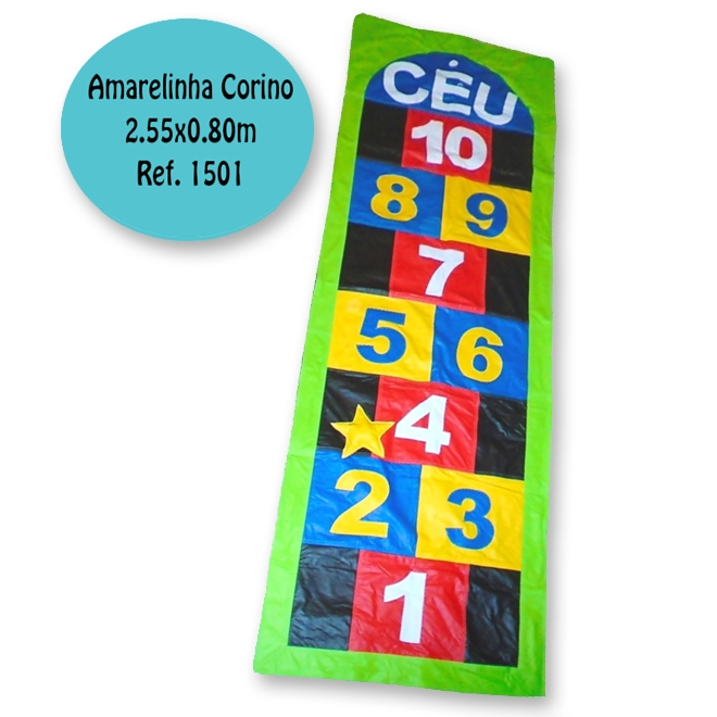 Jogo de amarelinha em forma de tapete confeccionada em corino colorido. Acompanha estrelinha. Este item estimula o convívio social, trabalha com cores e números. A sequência numérica que se exige para brincar de amarelinha incentiva o desenvolvimento do raciocínio lógico matemático, Os saltos dão mais agilidade, equilíbrio, coordenação e força.