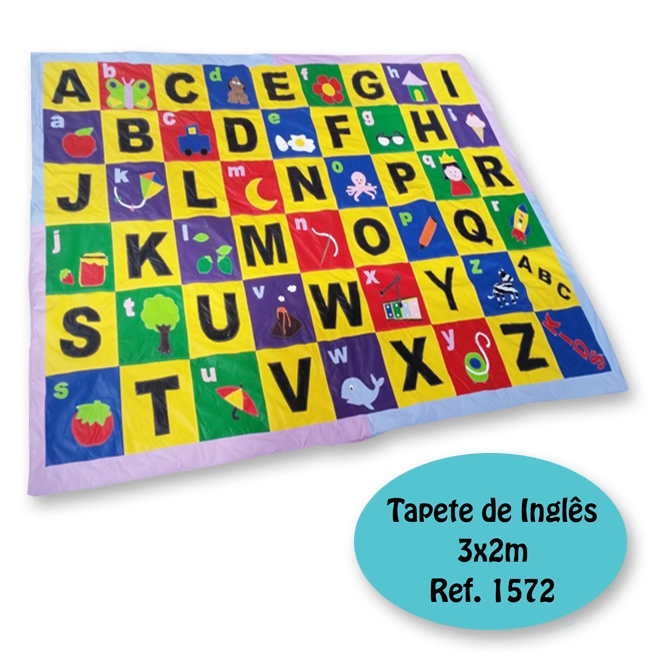 Tapete colorido confeccionado em corino, relacionando a primeira letra com o nome da figura em inglês. Auxilia na memorização das letras, das palavras e ainda pode ser utilizado para o conhecimento das cores.