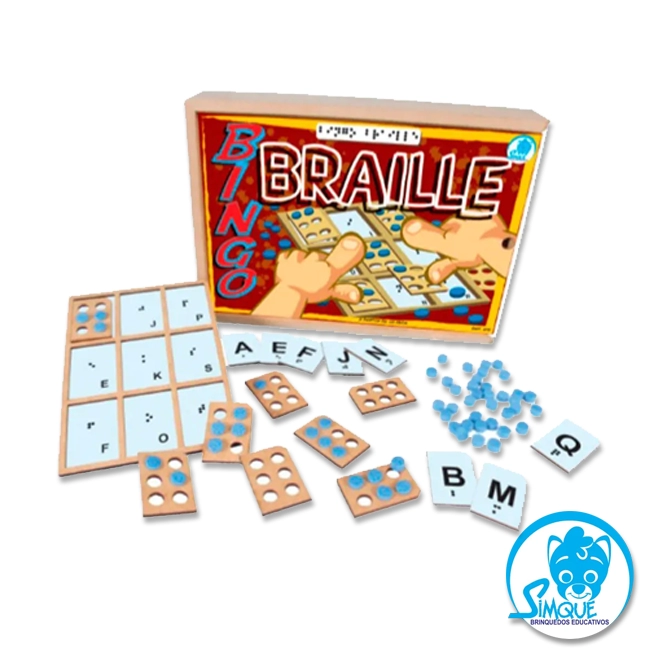Este divertido Jogo de Bingo Braille tem como objetivo desenvolver a atenção e a aprendizagem da leitura e escrita Braille. O jogo é composto por 6 cartelas com nove letras do Alfabeto Braille em cada uma. Joga-se com um Bingo convencional, Através da leitura verifica-se as letras cantadas e para marcar é necessário escrever a letra com o auxílio das fichas.