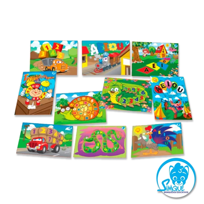 Cada placa contém peças destacáveis representando letras e números que são encaixadas nas placas. As crianças vão aprender, enquanto se divertem as primeiras noções de leitura.