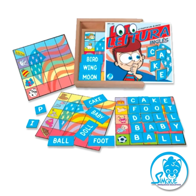 O Loto Leitura é composto por 6 placas com 5 desenhos em cada uma, relativos a palavras com 4 letras escritas em inglês, tem como objetivo desenvolver a atenção e a aprendizagem da leitura e escrita. É interessante utilizar com frequência este material. As repetições, o exercício de leitura, fazem parte da construção da linguagem escrita.