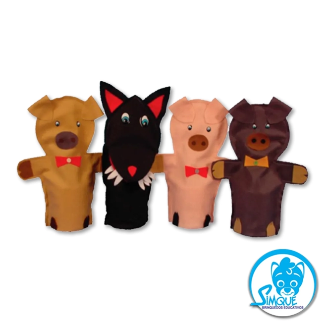 Conjunto de Fantoches Três Porquinhos, para criar e contar histórias. Composto por: 3 (três) Porquinhos e 1 (um) Lobo.