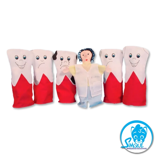 Conjunto de Fantoches Família Dentária, para criar e contar histórias. Composto por: 1 (um) Dentista, 5 (cinco) Dentes e uma Estória.