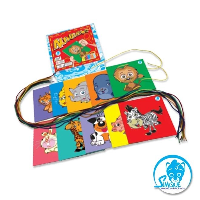 As placas coloridas, ilustradas com motivos infantis, contêm orifícios à volta do desenho principal. A criança deverá escolher um cordão e passá-lo pelos orifícios, seguindo a linha demarcada. Ao final, os alinhavos ressaltarão o contorno do desenho.
