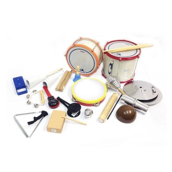Conjunto contendo 19 instrumentos musicais objetivando proporcionar atividades envolvendo ritmo, música, expressão verbal, favorecendo a capacidade de fixar atenção, concentração, socialização e expressão de sentimentos.
